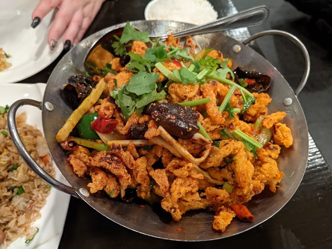 OMG! Where to begin. First off,I'm kinda a weird guy,I like to eat Exotic and weird stuff. When I saw the menu for this restaurant I had to go. First of all,very friendly and attentive employees. Now to the food I had. I started with the cold appetizers. The beef and tripe in chili sauce was to die for. The beef and tripe were both very tender and the quantity was incredible. This dish had a spicy, a little on the hot side taste. But overall very enjoyable. The second dish I had was the kidneys in chili sauce again a cold appetizer. The amount of food again was incredible, the dish was filled with kidney. Again very tender and tasty. Now my main meal was The dry pot pork intestines. This dish came with a heater under it loaded with peppers mushrooms pork intestines are you name it peppers like hot peppers onions it even had lotus root in it it was incredible incredible dish I could not finish it. Most of it came home with me. Can't wait to have it later. Overall all three dishes soda and tip came out to around $60 can't beat the price for what you get. They have a pretty big menu not everything is spicy. Take my word for it when in the area definitely, definitely visit this place. The menu is online and on yelp. Enjoy!